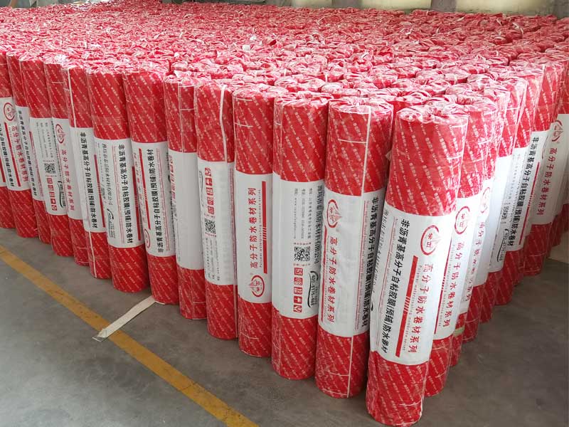 铺设第一幅预铺卷材时,先将卷材按弹好的基准线定位空铺在基面上,且卷材的高密度聚乙烯板的平滑光面面向基层,耐候颗粒层表面